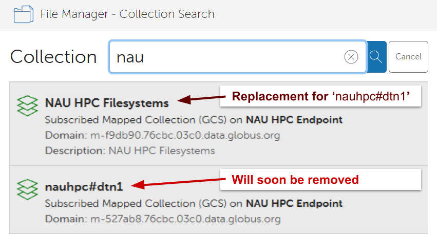 The newer NAU HPC Filesystems collection is effectively identical to the older nauhpc#dnt1 collection. However, if you have created a “guest collection” based on the older collection, you will need to create a new guest-collection (pointing to a directory on the newer collection) to continue sharing your files. Please contact ARC with any questions by emailing ask-arc@nau.edu to create a help-ticket.