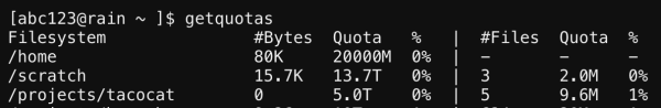Utilize the “getquotas” command to check your quotas on these storage areas. For example: