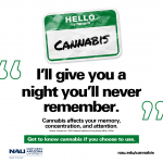 Learn more here about all things weed, including the science behind it, important laws and policies relevant to students at NAU, harm reduction strategies, and more! Take this free, anonymous, 30 minute online module to be in the know about all things cannabis.