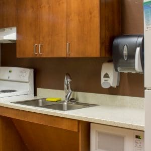 - In-room sink and mirror (community bathrooms)