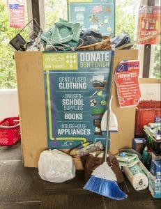 All on-campus residents can participate in the Donate, Don’t Ditch donation program. During spring move out, bins are located near community front desks for the donation of gently-used items. Needed items include clothing, school supplies, food, cleaning supplies and appliances!