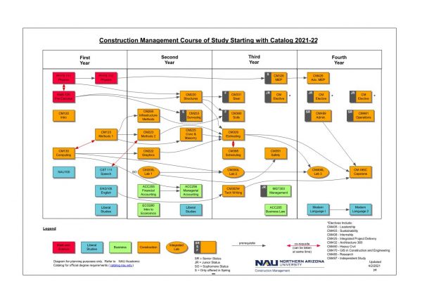 Details on degree requirements and courses for the CM degree and other degrees can be found in the current NAU Academic Catalog. The following is a PDF chart of the 4-year course progression plan that Construction Management students must complete before graduation.