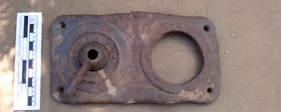 The lack of significant duplicate car parts at Apex indicates that most likely, one single, small vehicle was present. A rectangular ignition switch assembly reads “Ford” under the dial, and possibly dates between 1919 and 1925.