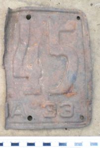 Interestingly, most of the license plates were broken or folded in half. While researching, I was unable to locate any sources indicating why this practice occurred. I theorize that due to license plates being reissued yearly and essentially acting as a registration, the car owners would destroy or fold their plates to indicate that they had expired and were unusable.