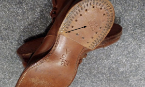 Writing on another two shoes’ heels suggest sole thickness, reading “M/9 1/2/11-IRON” and “Y / 21⁄2 / 14 IRON / 93 B-1” (see photo). IRON numbers are an older measure of the thickness of the leather. There are 48 irons in an inch. The embossing indicating 14 IRON would be constructed with leather about .30 of an inch while the Size 9 1/2 11 IRON shoe would have used leather approximately .23 of an inch thick.