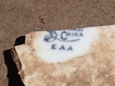 This month, we need some help with ceramic Maker’s Marks! First, we have two Buffalo China plates with the letters “EAA” under the logo and can’t decipher what they mean. They aren’t part of the company’s date code. Second, a partial maker’s mark seemingly reads “TU[…] / ROS […]” with the T extending down into the R. We haven’t been able to identify this one at all.
