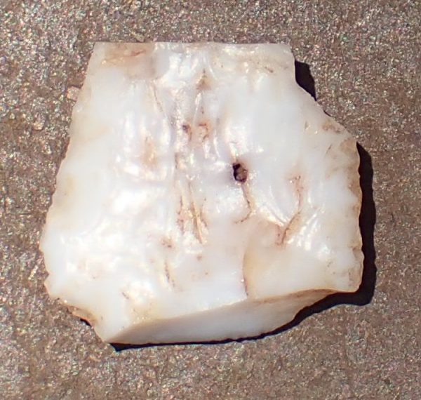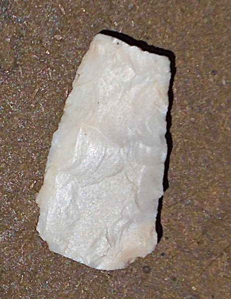 Aside from the smattering of debitage found across the site, two likely pre-contact projectile point fragments were also found at Apex–one at the kitchen and one at management housing. Both are white chert with bifacial knapping and approximately 15 to 20 cm wide.