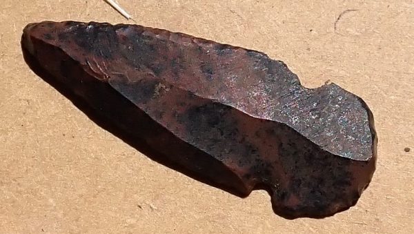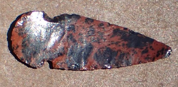 The artifact is a replica uniface, or one-sided, mahogany obsidian projectile point, measuring approximately 45 cm long by 16 cm wide. As all the other artifacts found in association with the point date to Apex’s time frame, we have no reason to doubt that this projectile point does as well. The point was simplistically flintknapped on just one side, while the other was left flat, perhaps for display purposes by the knapper or out of expediency. The material type (mahogany obsidian) can be found in Northern Arizona but not directly in the area near Apex. The raw material for the point was likely brought from outside the local area and appears to be created solely for tourism purposes.