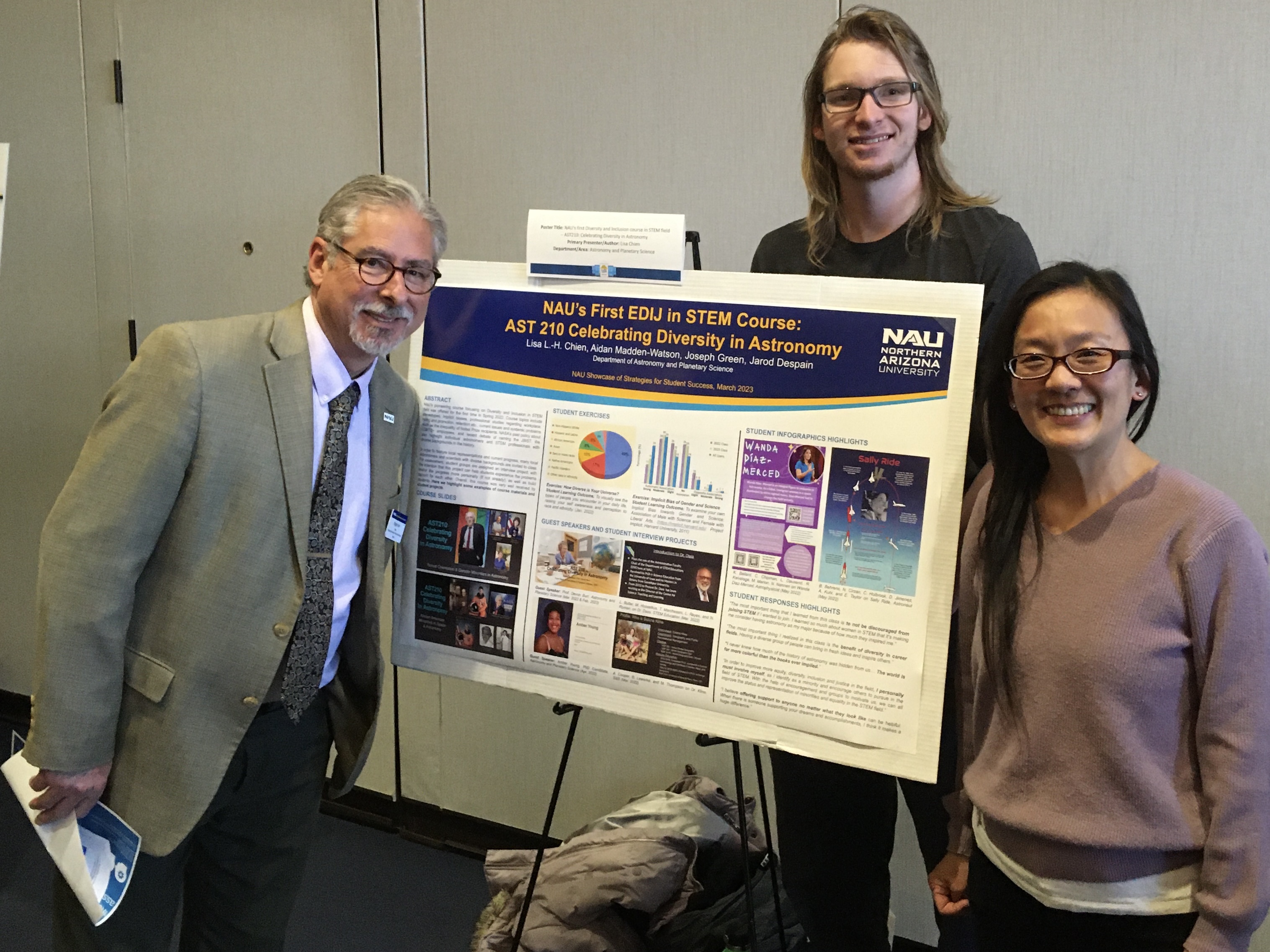 Lisa and her AST210 undergraduate TAs– Aidan Madden-Watson, Joey Green, Jarod Despain, presented their AST210 course to the NAU Showcase of Strategies of Student Success event at the High Country Conference Center. Their poster was titled NAU’s first EDIJ in STEM course: AST210 Celebrating Diversity in Astronomy and they talked about this course to some of the NAU leadership, including the CEFNS Dean and Vice President of Student Affairs.