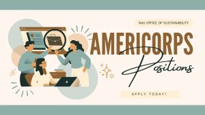 Are you interested in a new challenge and making a difference in sustainability? Consider applying to be a volunteer with AmeriCorps through the NAU Office of Sustainability. Currently, there are openings for a Sustainability in Research Labs Coordinator and an Environmental Justice and Inclusion Coordinator. These positions are a great opportunity to expand one’s involvement in the sustainability world, leadership, and team-building skills, as well as project management opportunities. These are paid positions.
