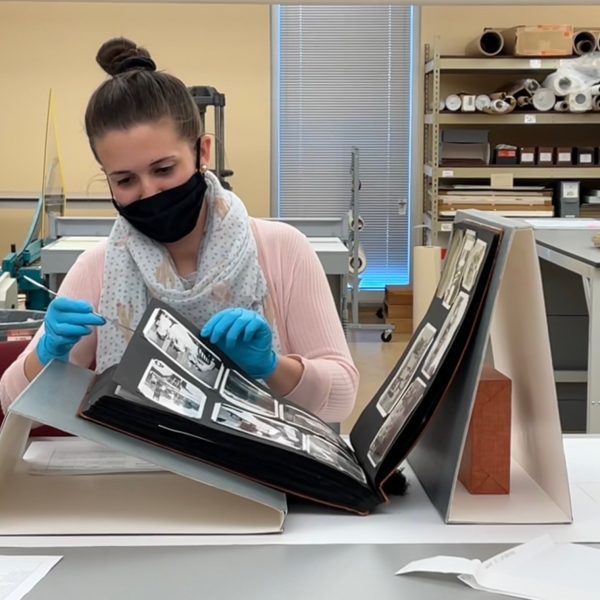 Congratulations to CCS alum Sophie Church (Art History emphasis with minors in Museum Studies, Studio Art, and Chemistry, 2017)! She joined both the Arizona State Library and the Center for Creative Photography as a conservation assistant and conservation technician in 2021. Sophie completed a M.A. in Art History in May 2019 at the University of Arizona. Her thesis research focused on the investigation of a sixteenth-century print by Ugo da Carpi from the University of Arizona Museum of Art’s collection. With the assistance of Conservators Dana Hemmenway, Dana Tepper, and Dr. Nancy Odegaard, Sophie provided scientific data to support her art historical research using techniques such as x-ray fluorescence and x-radiography. Additionally, she learned intaglio printmaking and mimicked the methods of early modern printmakers to gain insight into the materials used. This collaborative research lead Sophie to conclude that the UAMA’s print was not printed by Ugo da Carpi but by another workshop of this period after the artist’s death. In the image below, Sophie works in the conservation lab at the Arizona State Library in December 2021.