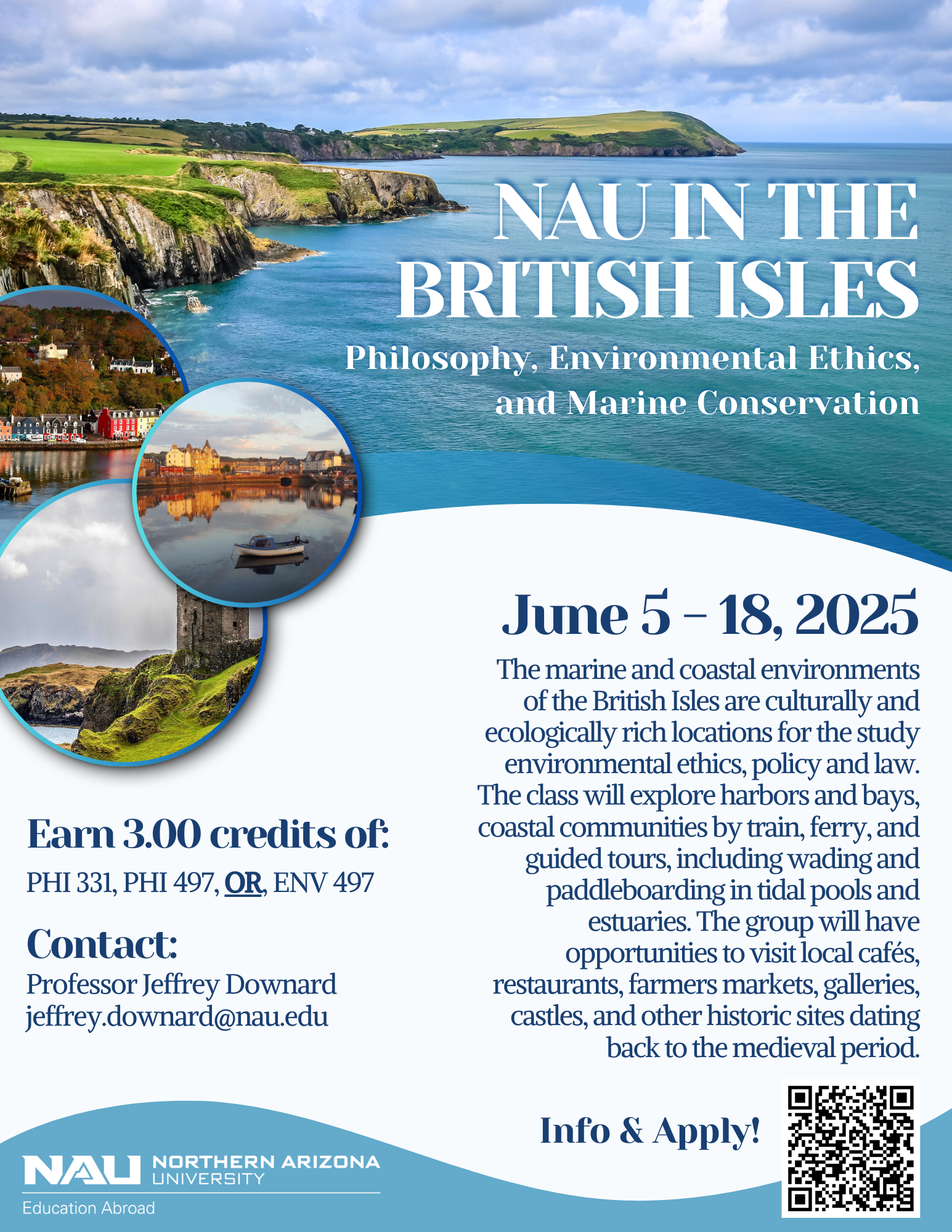 Spend your summer in the magnificent British Isles while earning PHI credit with NAU in the British Isles led by Dr. Downard! This unique opportunity combines hands-on learning with real-world impact, offering the option to take one of three courses that explore the intersection of law, public policy, and ethics.