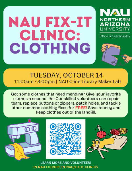 We are currently recruiting volunteers for our Fall 2025 Fix-It Clinics that will focus on clothing repair (such as mending buttons, zippers, and rips). If you have sewing skills and would like to volunteer, reach out to Danielle at danielle.linthicum@nau.edu or fill out our volunteer interest form.