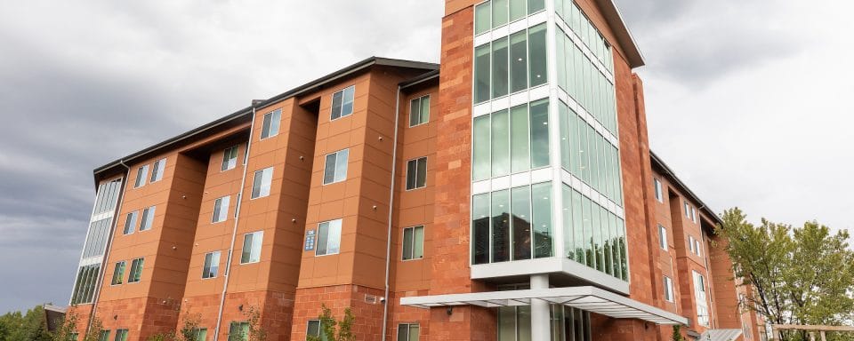 Honors students who apply to live on campus will live in the new Honors Campus Living Community building for first-year students as space is available. The 204,656-square-foot state-of-the-art building is designed to be a place where Honors students can live, study, congregate and collaborate with others who are passionate about learning and creating. In addition to student rooms, the building includes eight state-of the-art classrooms, an Honors writing center, faculty offices, an Honors student support center, an exercise facility and more.