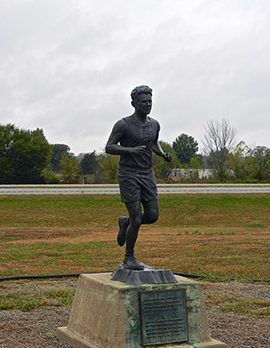 Through the remaining states, runners continued to drop out, some of them struck by vehicles or motorcycles. On the last day of the race only 55 runners remained. Andy crossed the finish line in first place on May 26, 1928, covering 3,422.3 miles in a little more than 573 hours and earning him the first place prize of $25,000. Following his win, he was married and settled down in his home state where he served as a clerk to the Supreme Court of Oklahoma and died in 1977. Every year Oklahoma City holds the Andy Payne Bunion Run, a marathon to honor their home state hero. A bronze statue of Andy stands along Route 66 in Foyil, Oklahoma, where our Own Sean Evans and his wife took this photograph.
