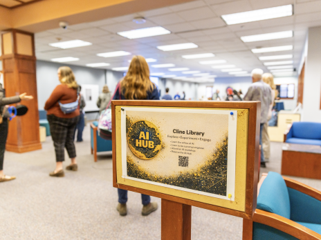 The AI Hub at Cline Library was established by a generous gift from James Owens and the NAU ITS department. The Hub includes a large screen display, showcasing work produced by NAU faculty, staff, and students engaging with AI tools. Five student AI Ambassadors and an AI Initiatives Librarian are available to provide support in the exploration of, experimentation with, and engagement in tools, technologies, ethics, and academic use of AI.