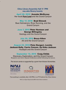 In celebration of Grand Canyon National Park’s (GCNP) Centennial (February 26, 2019), Northern Arizona University’s Cline Library, in partnership with Grand Canyon Conservancy, is hosting a new summer lecture series to raise awareness of Grand Canyon National Park’s historical and cultural impact on the state and region in the last 100 years. Funding for this summer lecture series was made possible by a grant from… Read more