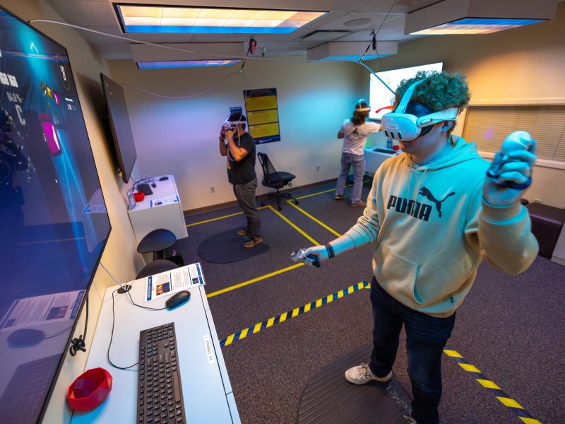 The Virtual Reality Studio is located in room 140 on the first floor of the Cline Library, adjacent to the Student Technology Center. NAU and CCC students, staff, and faculty are permitted to reserve one console within this shared space for up to two hours per day.