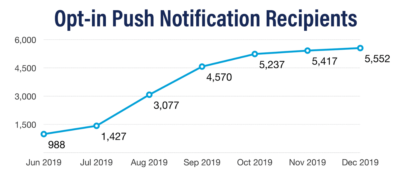The 2019-2020 academic year saw the largest increase in app users thus far. We welcome the over 13,000 new users that downloaded the NAUgo app in the last year and saw an average of over 17,000 screen views per day.