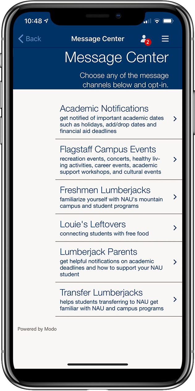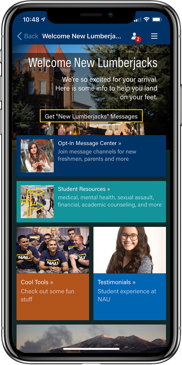 - We launched our first new persona in the app. In response to the CDC recommendations, NAU cancelled their in-person new student orientations. The “Welcome New Lumberjacks” persona provided information for our incoming freshmen and transfer students in lieu of the traditional orientations. Also launching this fall is the “Statewide Campus” persona which provides tools specifically for students across our Arizona campuses.