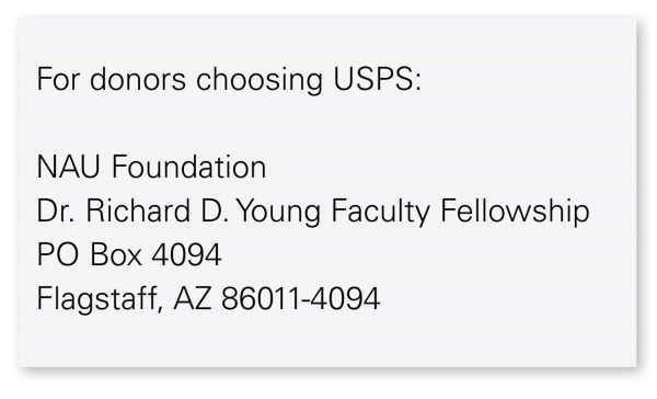 The Richard D. Young Faculty Fellowship is a permanent endowment fund that supports our students through the NAU Foundation’s investment earnings. The principal is responsibly invested by The NAU Foundation, and a portion of the annual returns is used to fund research and train students—ensuring long-term impact. Your gift becomes part of a lasting legacy that grows over time.
