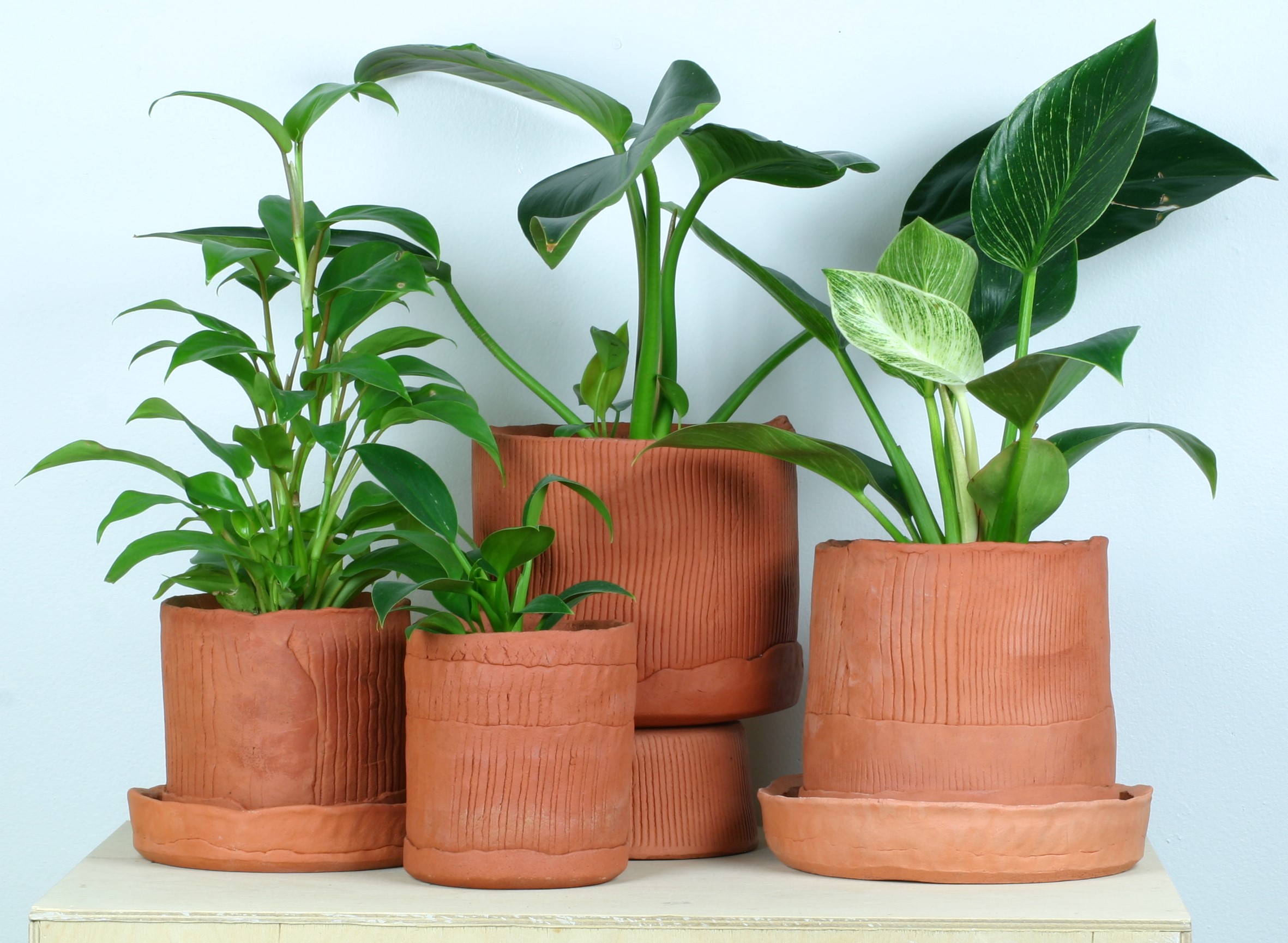 The pots I have been creating this semester are meant to hold, enhance, and display a collection of living things, functionally—these living things being members of the genus Philodendron. These pieces are meant to be demonstrative of time and process: the foliage growing as it spends more time in a space, the ritual nature of tending, and the natural white/yellow patina of soluble salts and minerals through the terracotta’s porous walls.