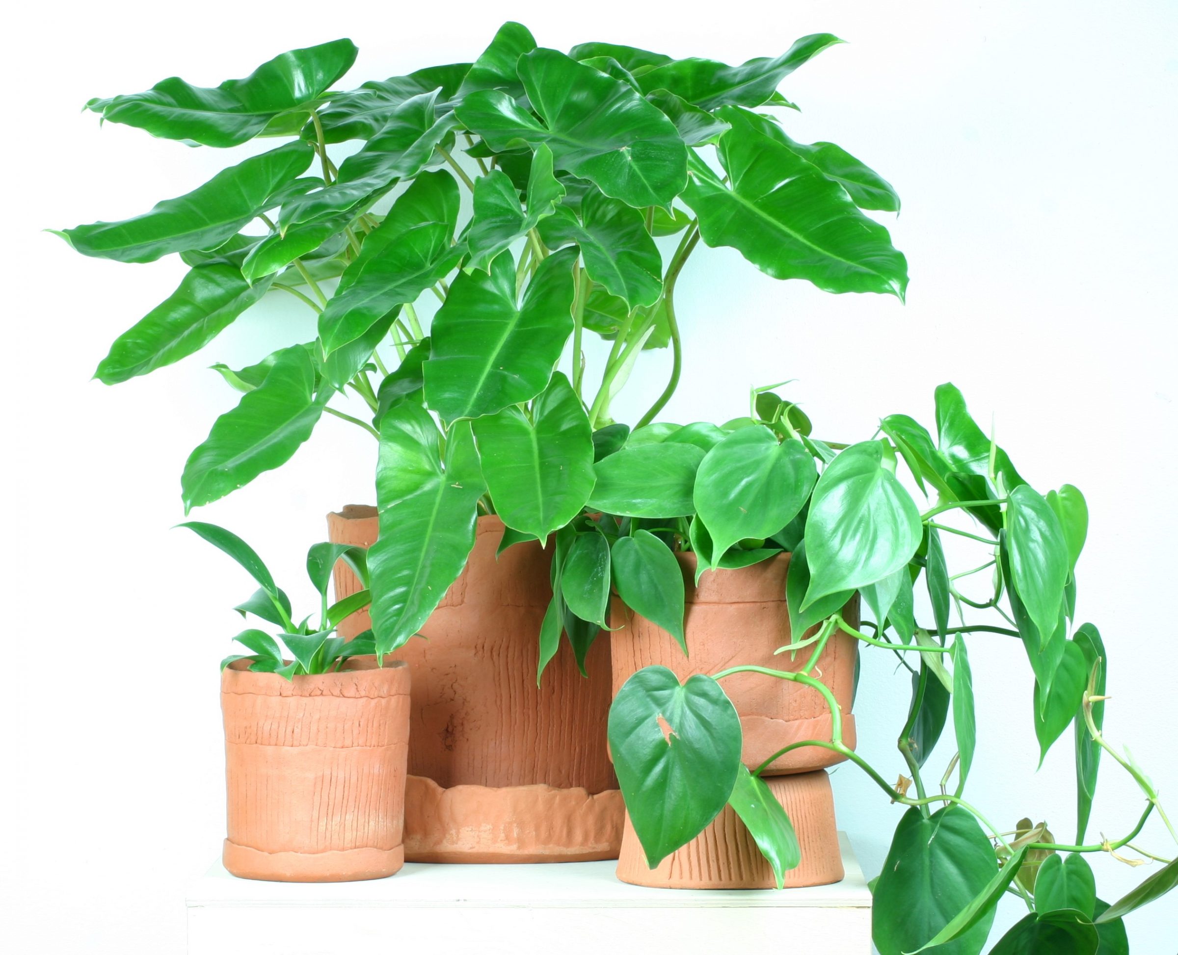“Good Ol’ Green Guys” (2021_, Terracotta, Soil, Assorted Philodendron; P. ‘Mia’: 5.5″x5.5″x10″, P. Burle Marx: 10.5″x10.5″x24″, P. hederaceum (heartleaf): 6″x6″x8″