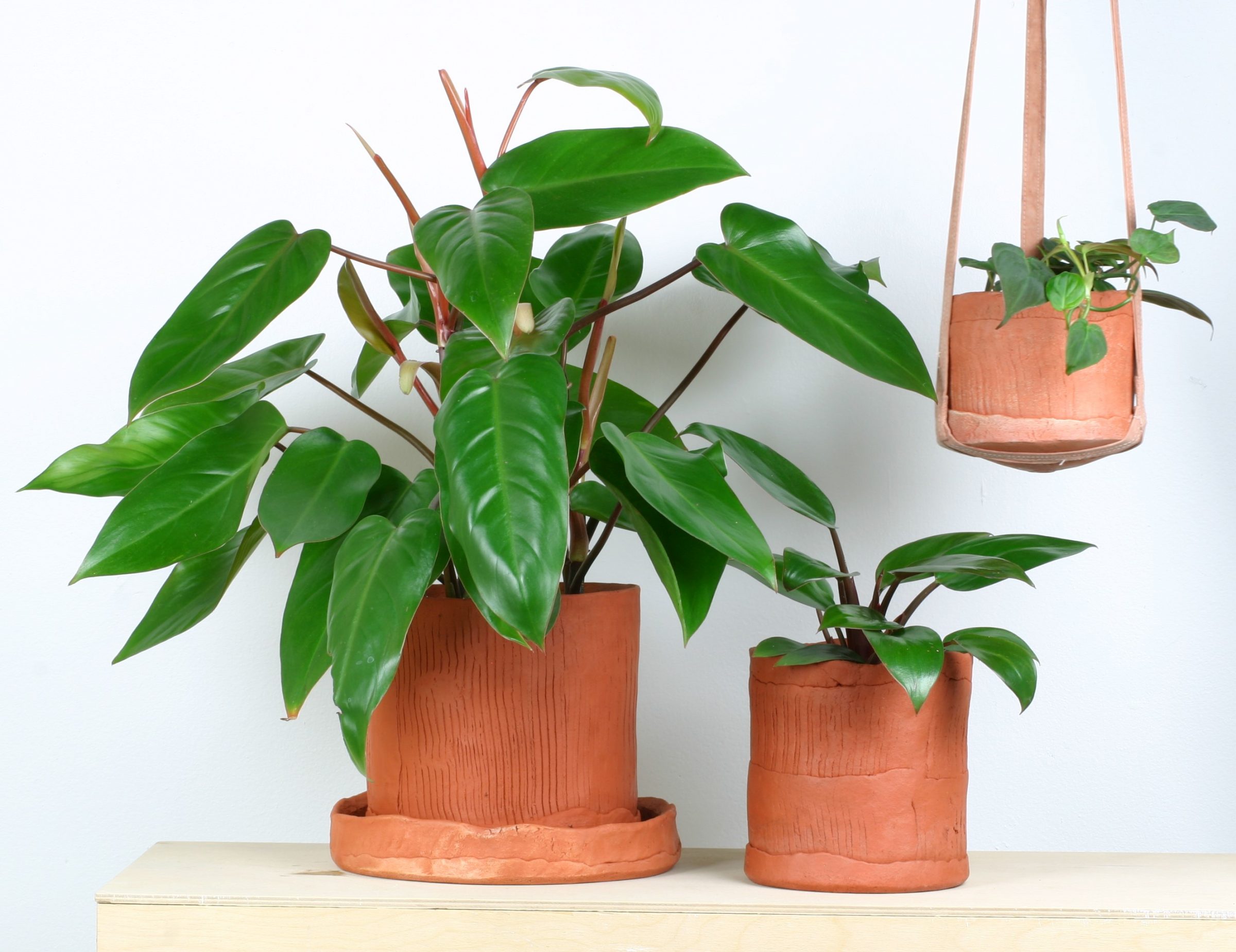 “Notes of Red” (2021), Terracotta, Soil, Assorted Philodendron, Cotton, Polyester Thread; P. erubescens (‘Red Emerald’): 8.5″x8.5″x23″, P. ‘Congo Rojo’: 7″x7″x11.5”, P. hederaceum ‘Micans’: 4″x4″x32″ (including hanger)