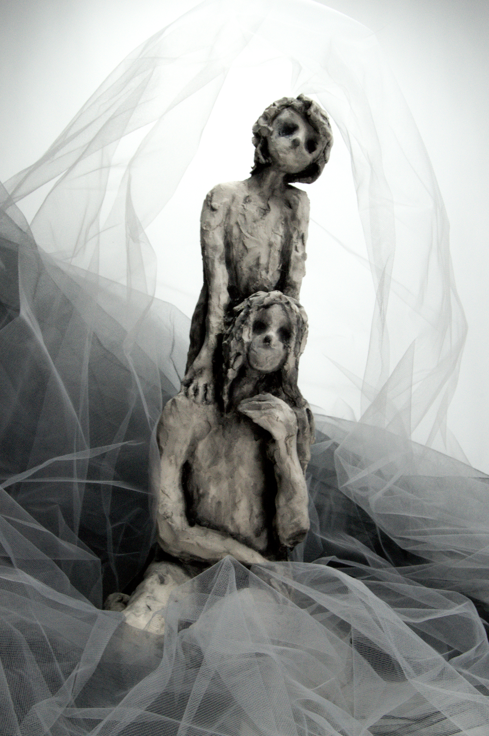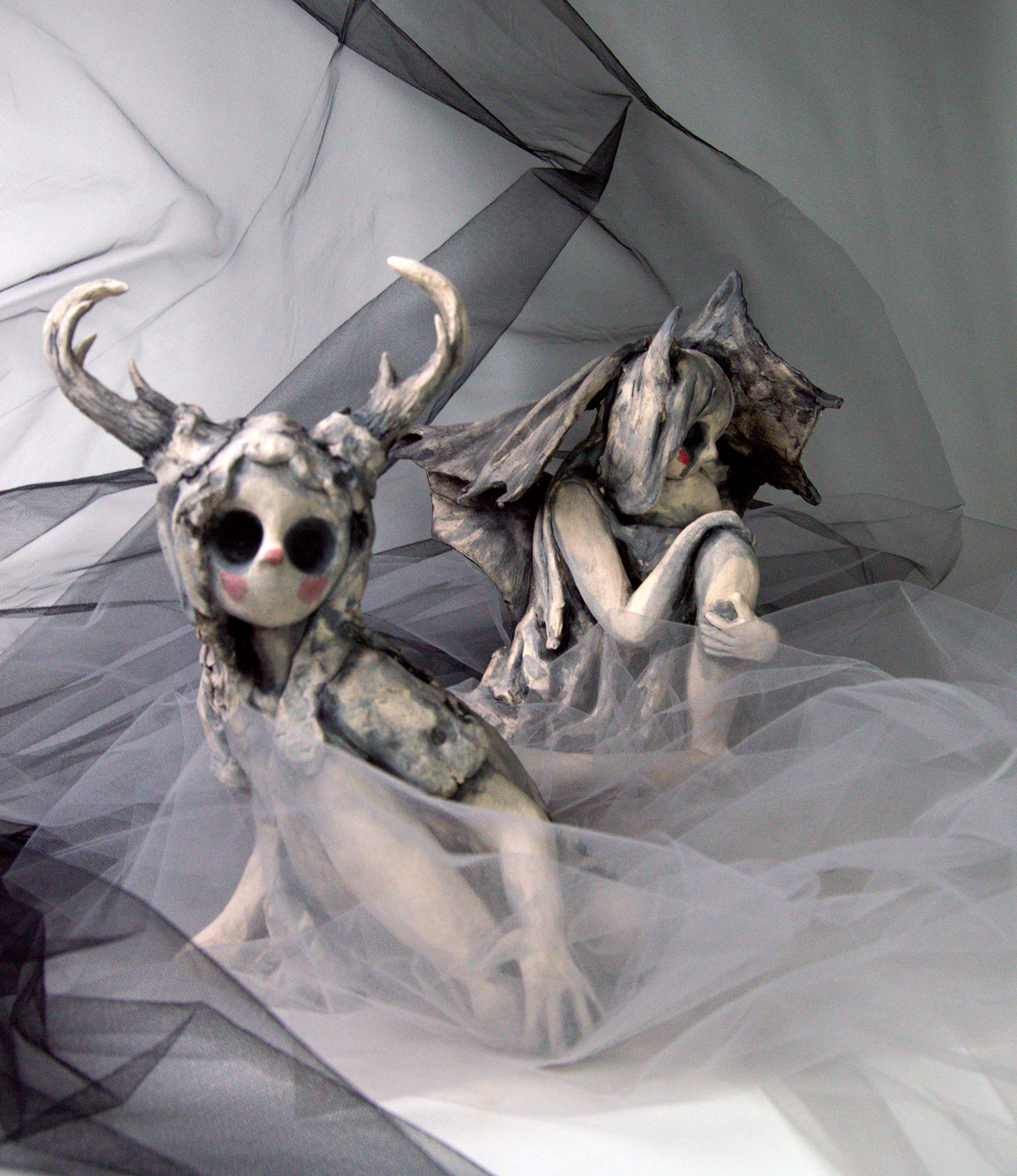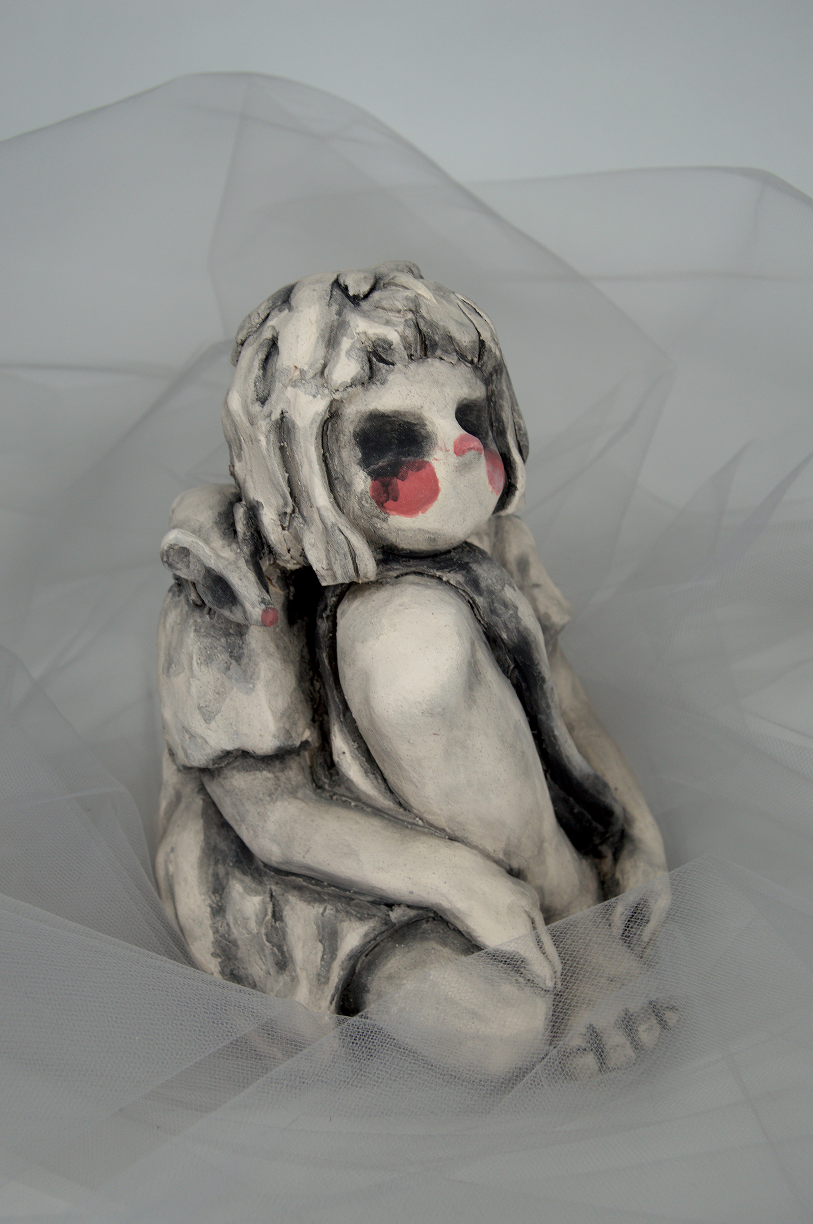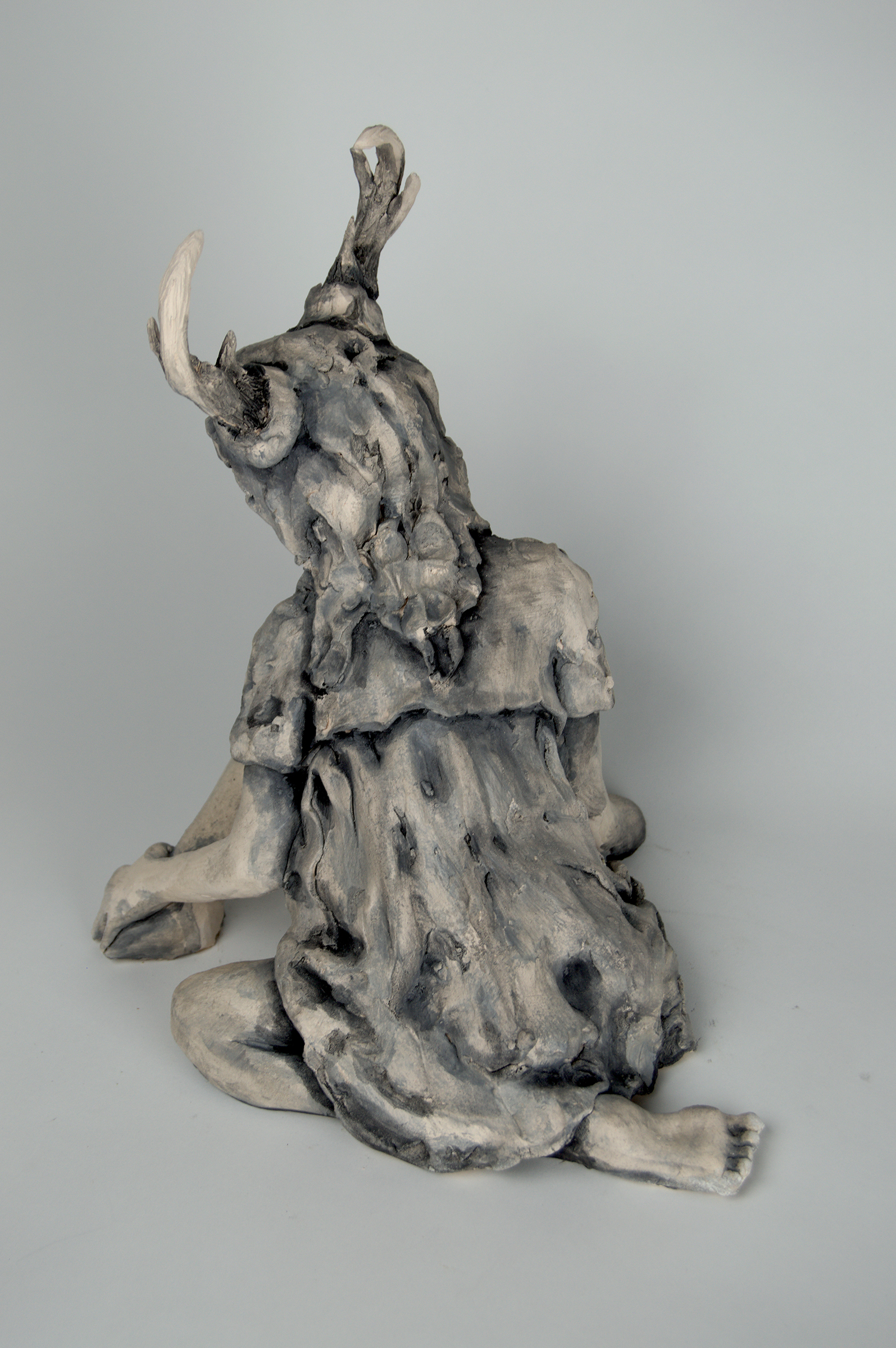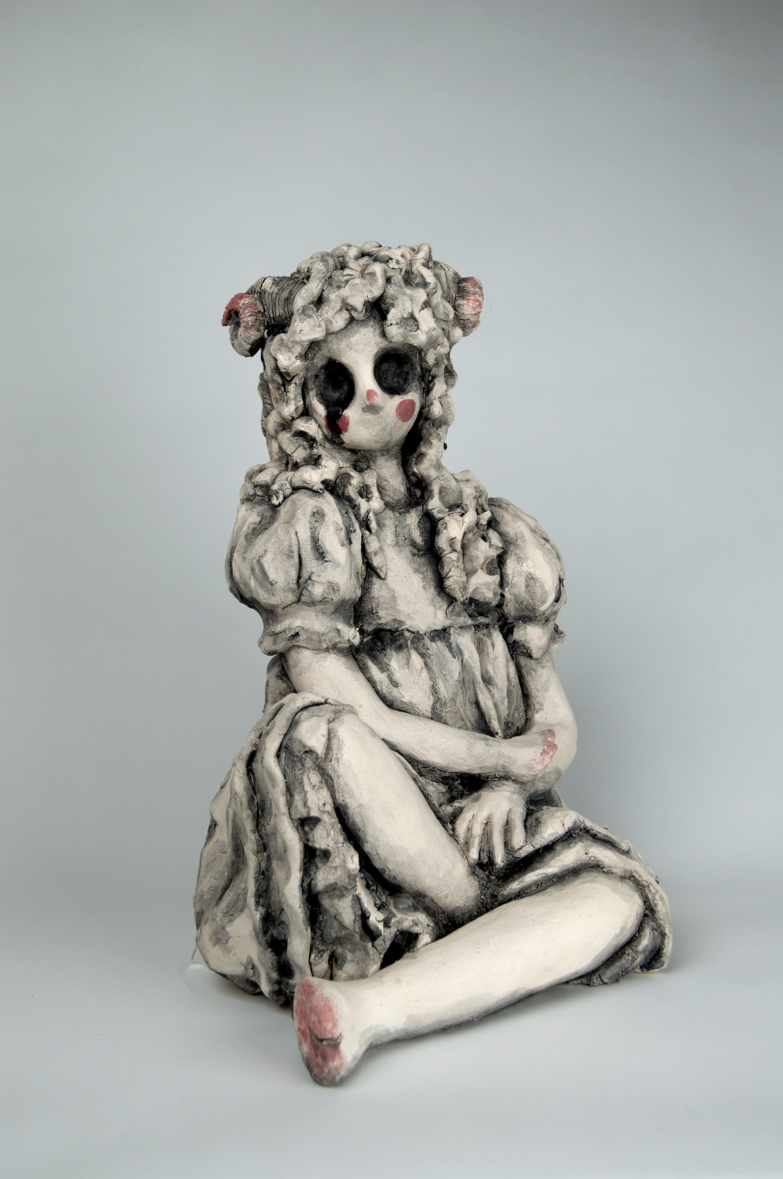 These distorted figurative ceramic sculptures of young girls address themes of discomfort under the male gaze, and the performative and dehumanizing nature of womanhood (that) often encroaches on girlhood, and disrupts childhood. This dehumanization is represented through the physical distortion of the body, and introduction of animal features. The gaze of these pieces is intended to unsettle in a manner that parallels the unrest that misogyny affected people often experience throughout their lives.