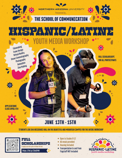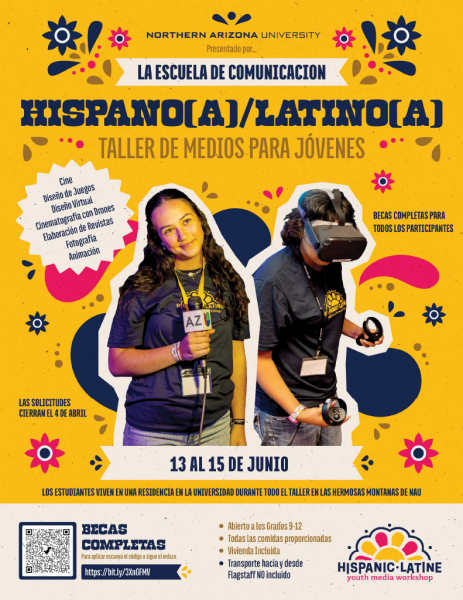The Hispanic/Latine Youth Media Workshop is a two-day immersive media production experience. The goals of this workshop are for students to be inspired to attend college and to feel welcome on the NAU campus. This will be a hands-on multimedia workshop, in which the students will participate in Virtual Reality, Game Design, Zine Making, Animation, and Filmmaking. NAU School of Communication Visual Communication and Creative Media and Film faculty will lead the workshop supported by Hispanic college student production assistants.