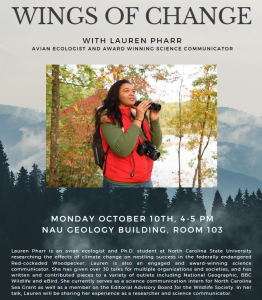 Please join us for a special seminar by Lauren Pharr, avian ecologist and award winning science communicator. Lauren will be giving her talk, “Wings of Change”, on Monday October 10th at 4PM in Geology Room 103. Her talk will focus on her experience researching the effects of climate change on birds and as a science communicator