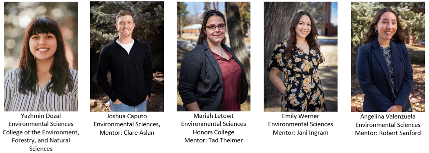 Congratulations to Environmental Sciences (ENV) students Yazhmin Dozal, selected as the Distinguished Senior from the College of the Environment, Forestry, and Natural Sciences, and Joshua Caputo, an NAU President’s Prize winner! Joining Joshua on the Gold Axe Award list this semester are Mariah Letowt (ENV), Angelina Valenzuela (ENV), Emily Werner (ENV), and Sierra Gleason (GLG minor).
